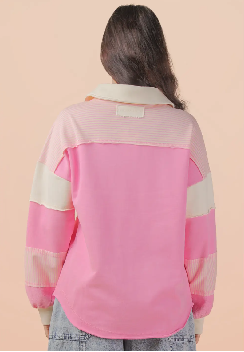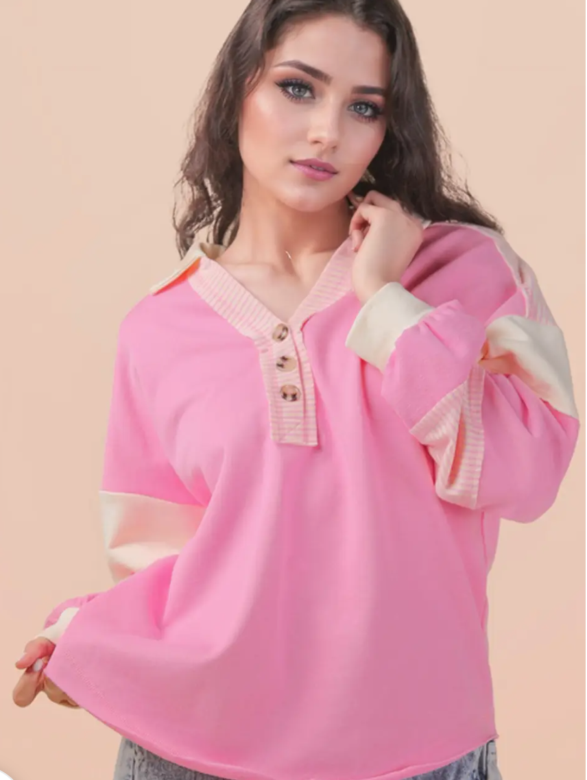 The oversized fit provides a relaxed silhouette that flatters all body types, making it an ideal choice for any occasion. Whether you're heading out for brunch with friends, running errands, or simply lounging at home, this top has got you covered. The vibrant color block design adds a playful touch to your outfit, allowing you to express your unique style effortlessly.
