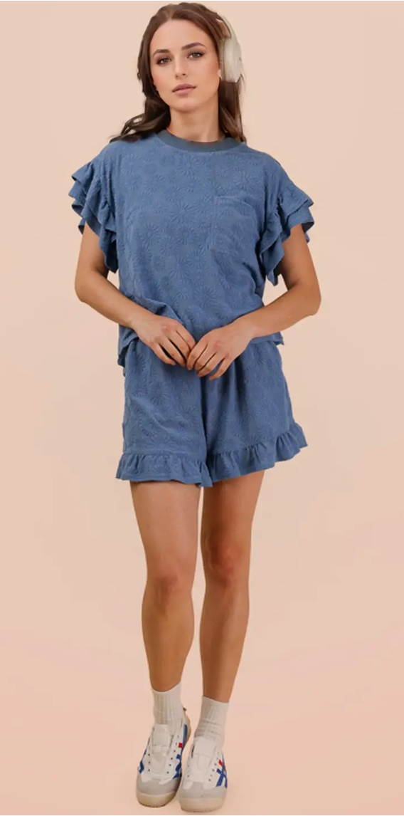 Whether you're lounging at home or exploring the outdoors, the Floral Textured Ruffled Knit Top & Shorts Set is your go-to choice for effortless style. Don't miss out on this must-have addition to your summer collection—grab yours today and step out in confidence!