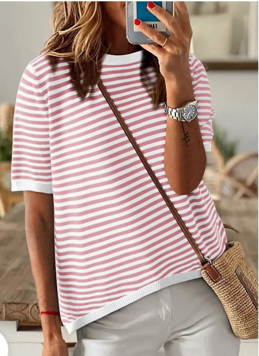 Crafted from a soft, breathable knit fabric, this sweater features a vibrant striped colorblock design that adds a pop of personality to your look. The crew neck style offers a classic silhouette, while the relaxed fit ensures you stay comfortable all day long. Whether you're heading out for brunch with friends or lounging at home, this sweater is versatile enough to suit any occasion.